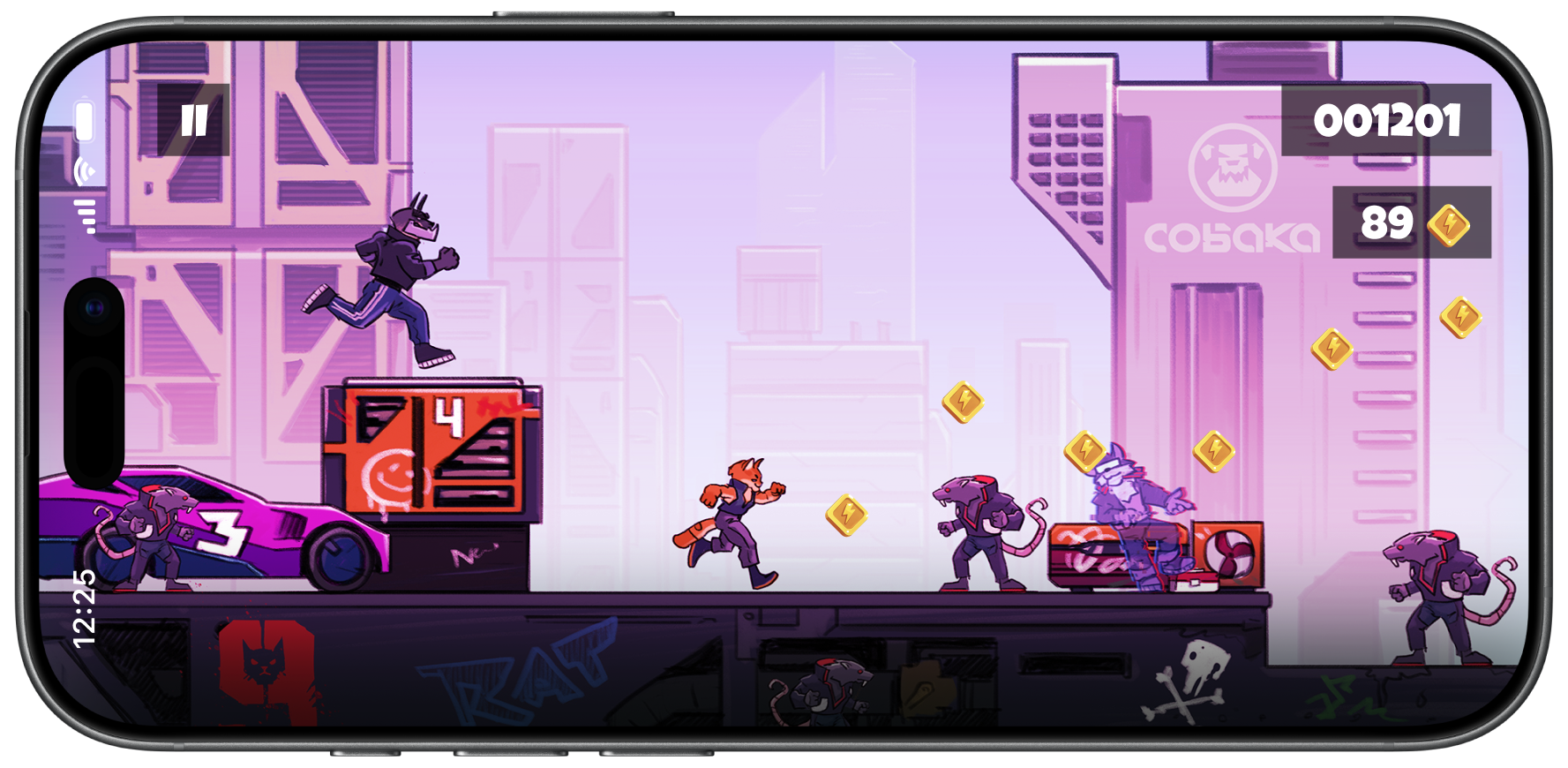 A musical runner where cats battle rats in a cyberpunk style